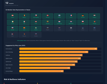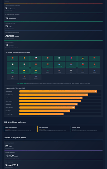 Monitors evolving ties between Brussels and Taipei through parliamentary exchanges, trade volumes, investment screening developments, and cultural cooperation indicators. Updated following European Parliament resolutions and Council position shifts. Click the image to view: