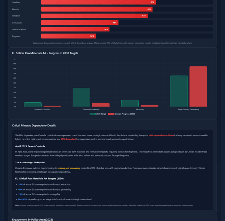 Comprehensive monitoring of bilateral engagement across trade, investment, technology transfer, and diplomatic initiatives. Data sourced from European Commission reports, customs statistics, and official statements from EU institutions and member state capitals. Click the image to view: