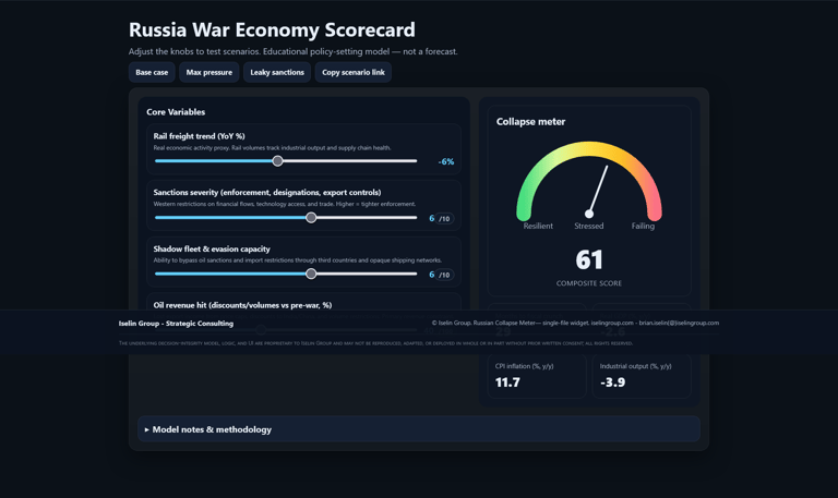 Multi-indicator dashboard measuring economic stability, political cohesion, and resource depletion across the Russian Federation. Methodology incorporates oil revenue calculations, National Wealth Fund depletion rates, sanctions effectiveness metrics, and regional autonomy indicators. Click the image to view: