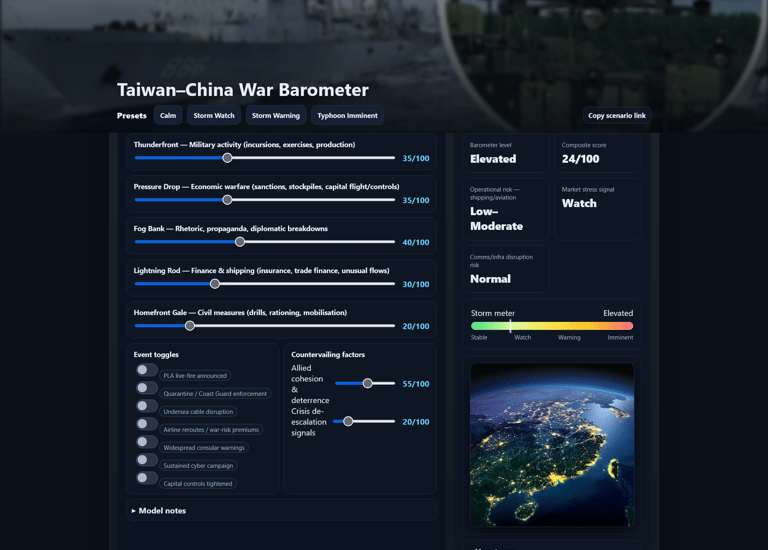 Probability-weighted assessment tracking cross-strait tensions through military readiness indicators, diplomatic developments, and economic interdependence metrics. Combines frequency of PLA activity near Taiwan ADIZ, semiconductor supply chain dynamics, and US security commitment signals. Click the image to view:
